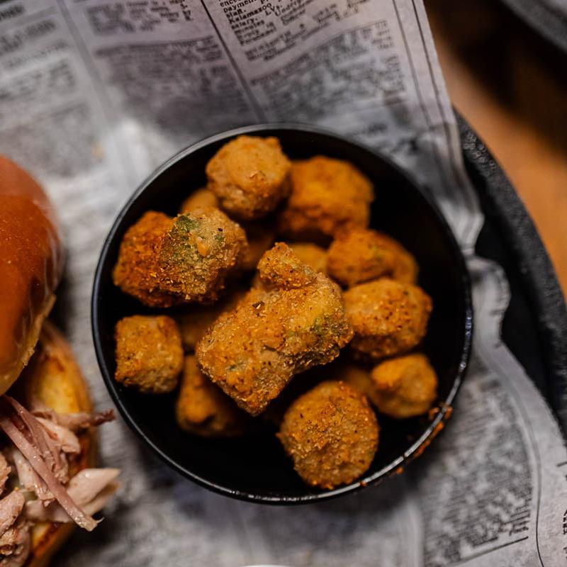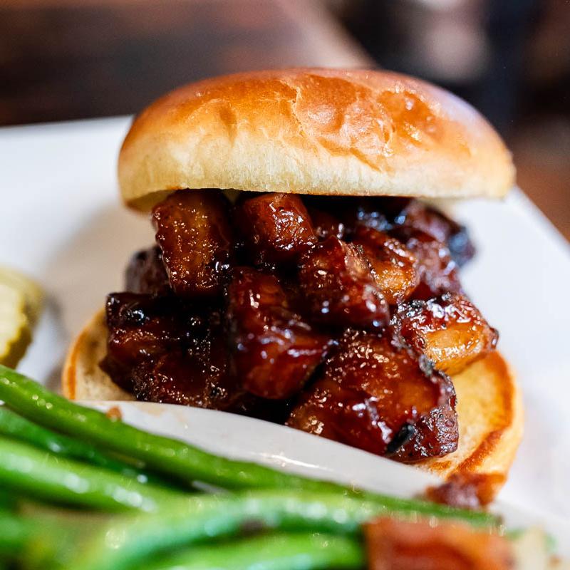 Brined Pork Belly is slow smoked & lightly basted with Sweet Original. It's then finished on the flattop for a caramelized deliciousness. Served on a brioche bun.
