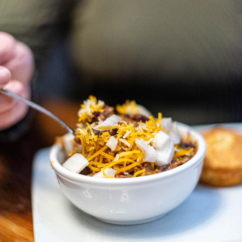A mixture of three cheeses, green chilies, & bacon is combined with cavatappi pasta to create a rich & creamy comfort delight. Dusted with a buttery panko crumb topping. Served with cornbread. • Pulled Pork or Pulled Chicken (+$2), Brisket, Grilled Chicken, Pork Belly, Crawfish, or Sausage (+$3)