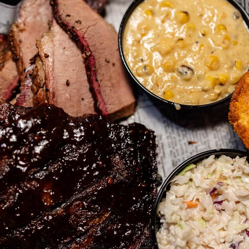 Full Rack of St. Louis Ribs, Whole Chicken, Half Pound of Pulled Pork, Half Pound of Beef Brisket. Served with 4 large sides, & 6 Cornbread. Serves up to 5-7 people.