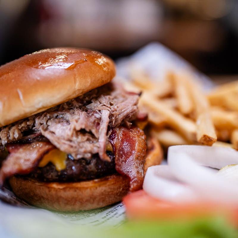 Half-pound Angus burger piled high with Smoked Bacon, Cheddar Cheese, & our slow-smoked Pulled Pork. Served with lettuce, tomato, pickles & onion.
