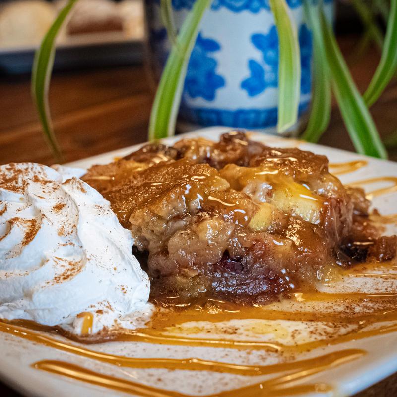 Grandma would be proud! Served warm with whipped cream & caramel.