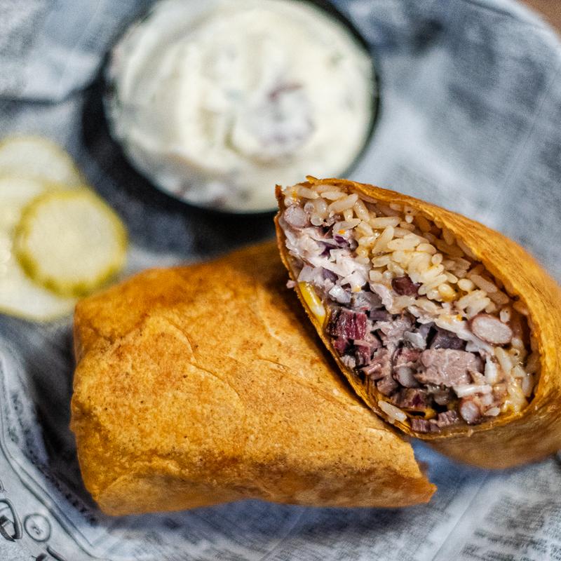 Our chipotle flour tortilla is stuffed with red beans, rice, shredded cheese, coleslaw & choice of pulled pork, or pulled chicken. Sub Beef Brisket, Pork Belly, or Catfish (+$2)